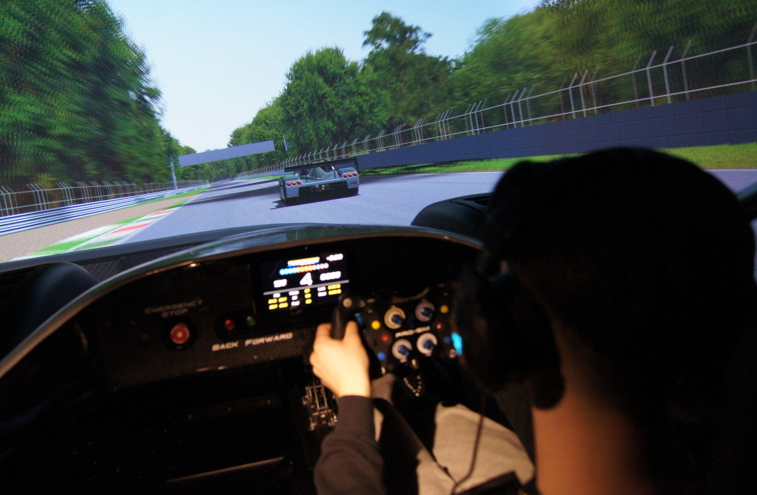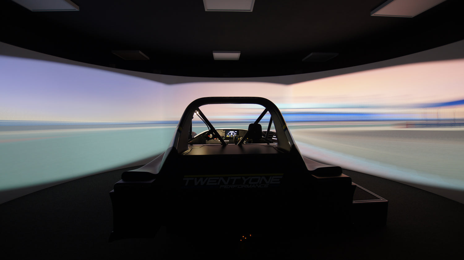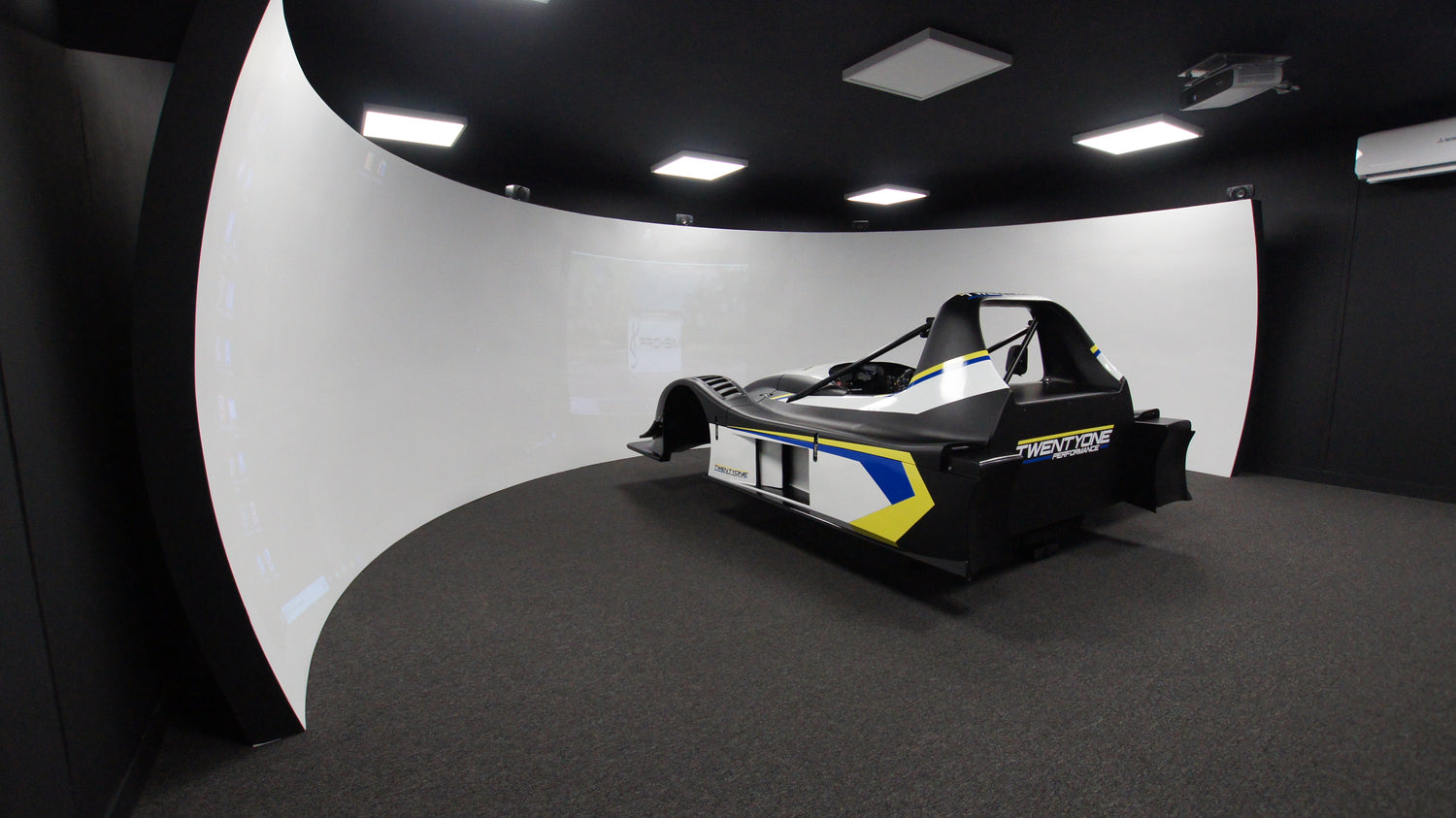 Our simulator features a 186°, 6 metre double curved screen. The screen fully immerses and surrounds the driver for a true on track feeling that is to scale.